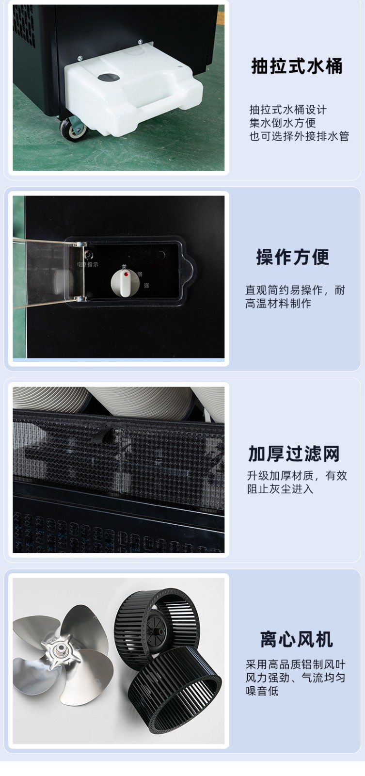 8、機身一體化設計,科學(xué)布局,可機內儲水桶積水.也可接水管排水,附帶除濕效果