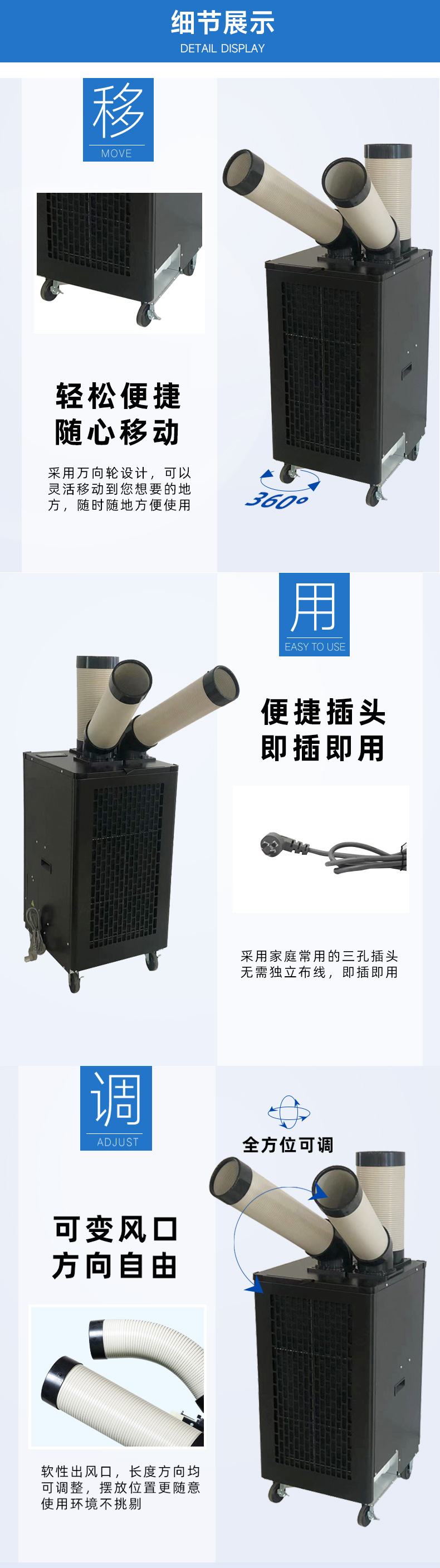 6、兩個(gè)冷風(fēng)口均可270度旋轉,適用于3-5個(gè)崗位的降溫