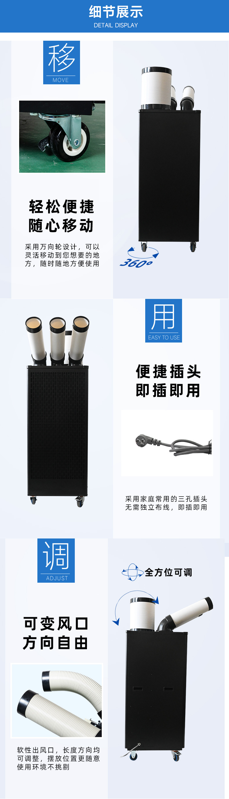 6、三個(gè)冷風(fēng)口均可270度擺風(fēng),適用于3-5個(gè)崗位的降溫