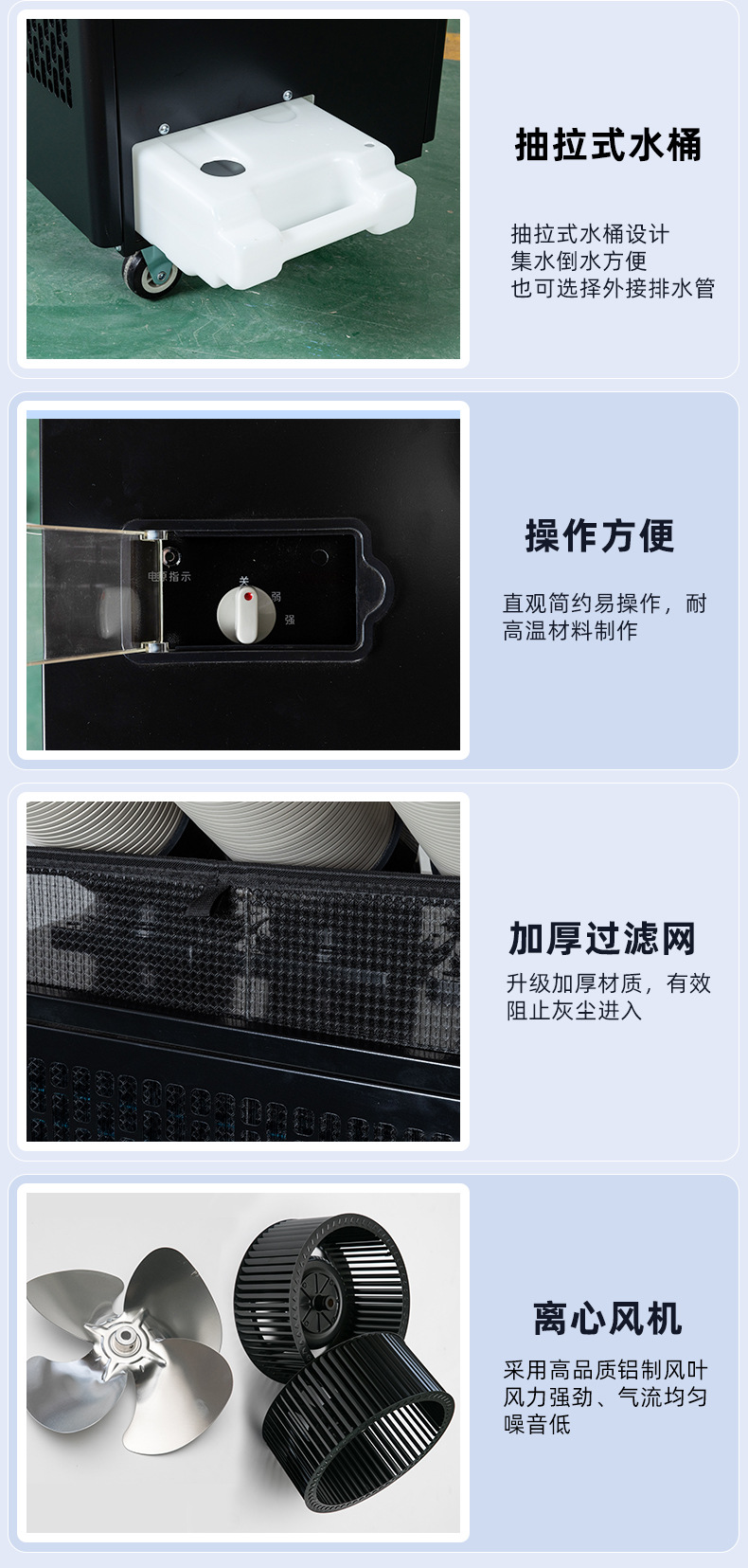 8、機身一體化設計,科學(xué)布局,可機內儲水桶積水.也可接水管排水,附帶除濕效果