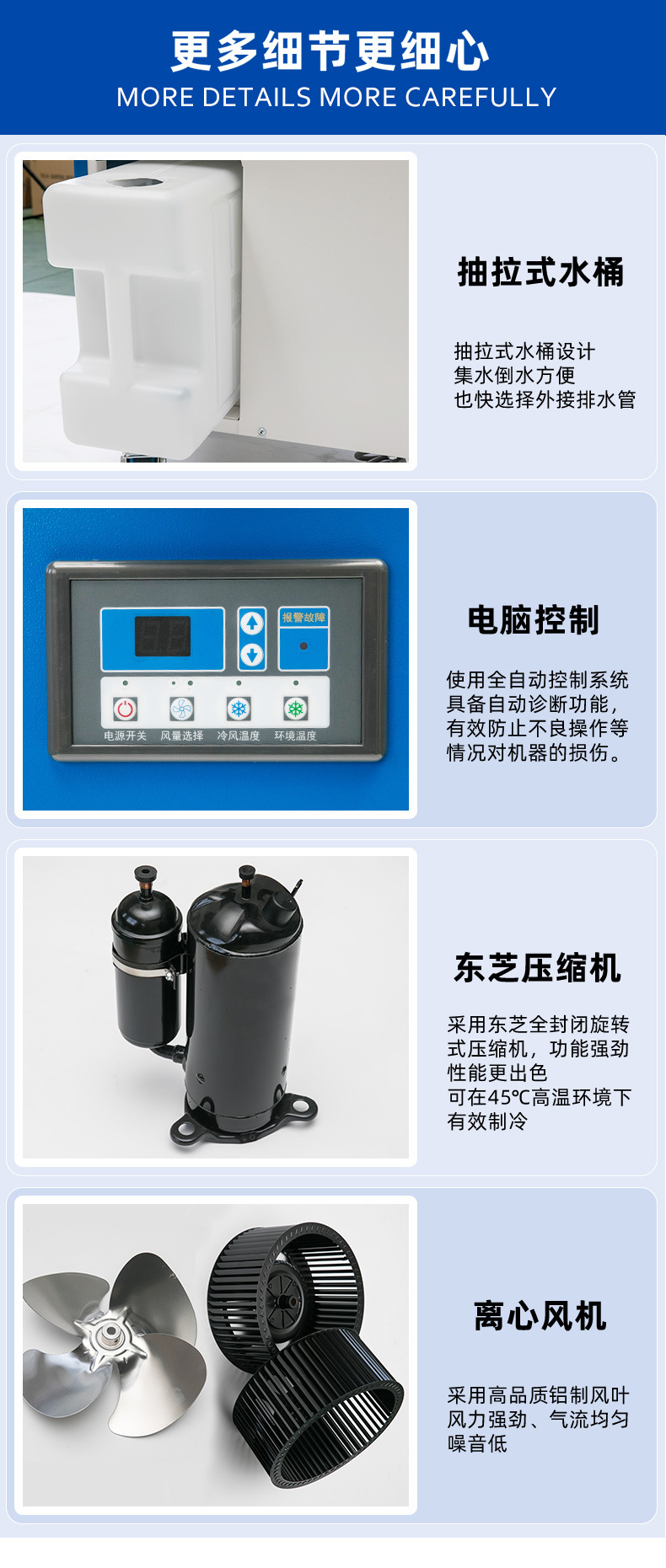 8、機身一體化設計,科學(xué)布局,可機內儲水桶積水.也可接水管排水,附帶除濕效果