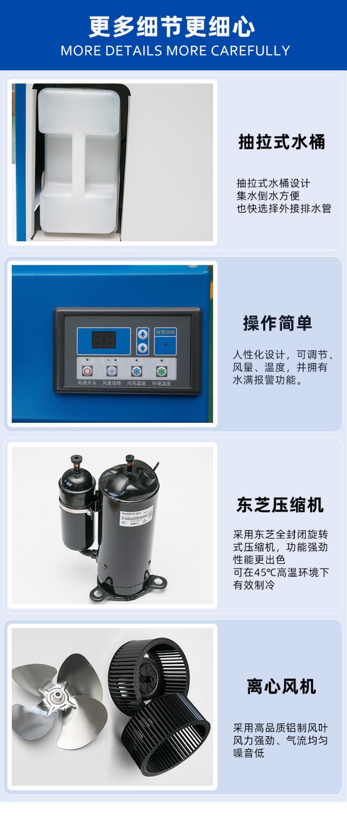 8、機身一體化設計,科學(xué)布局,可機內儲水桶積水.也可接水管排水,附帶除濕效果